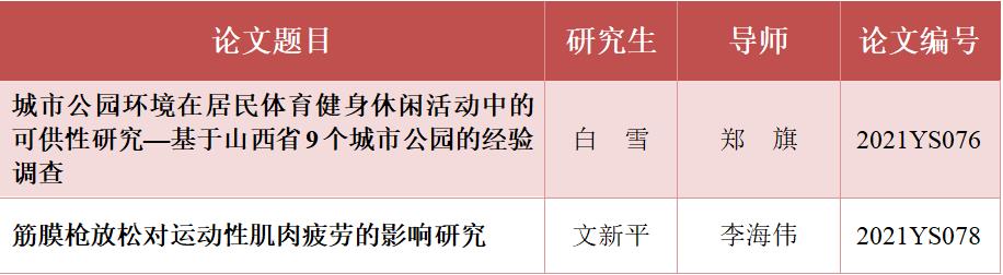 近日山西省人民政府学位委员会公布了山西省2021年优秀博士、硕士学位论文的评选结果,公司体育学研究生白雪和体育硕士研究生文新平二人的学位论文入选。