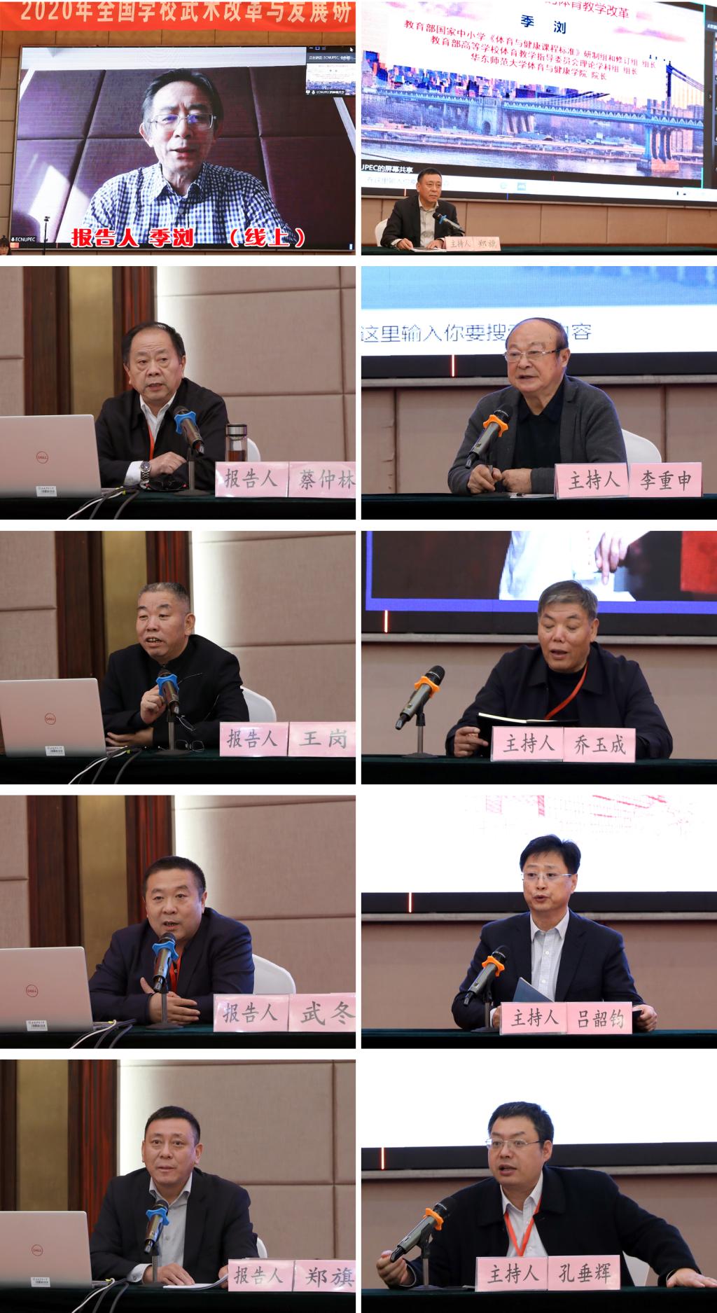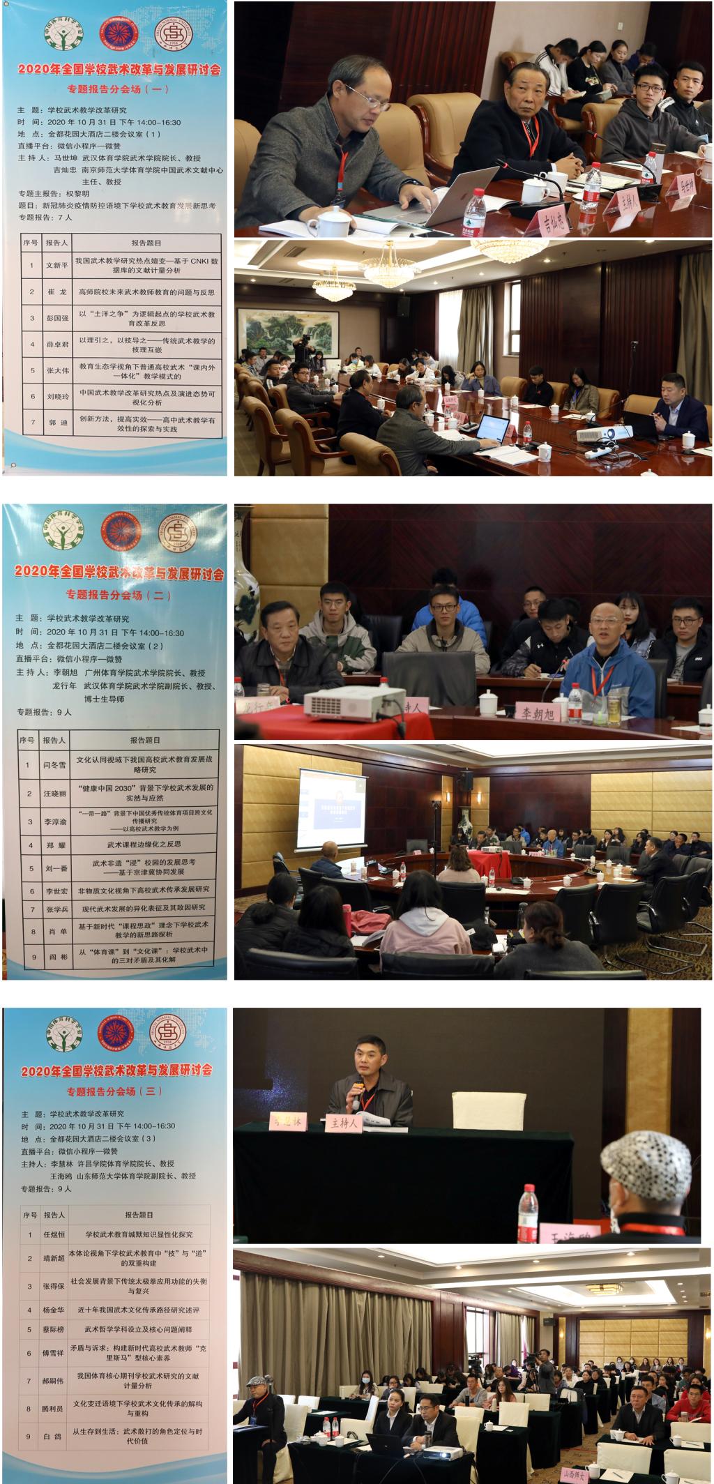 专题报告环节采用“线上报告+现场点评”的方式进行,必威西汉姆官网平台权黎明副教授在现场做了题为《新冠肺炎疫情防控语境下公司武术教育发展新思考》的报告,其余25位论文作者围绕“公司武术教学改革研究”、“公司武术发展研究”、“公司武术文化传承研究”等主题做了专题交流。武汉必威西汉姆官网平台马世坤教授、南京师范大学吉灿忠教授、广州必威西汉姆官网平台李朝旭教授、武汉必威西汉姆官网平台龙行年教授、许昌公司李慧林教授、山东师范大学王海鸥教授在会议现场对报告做了精彩点评。