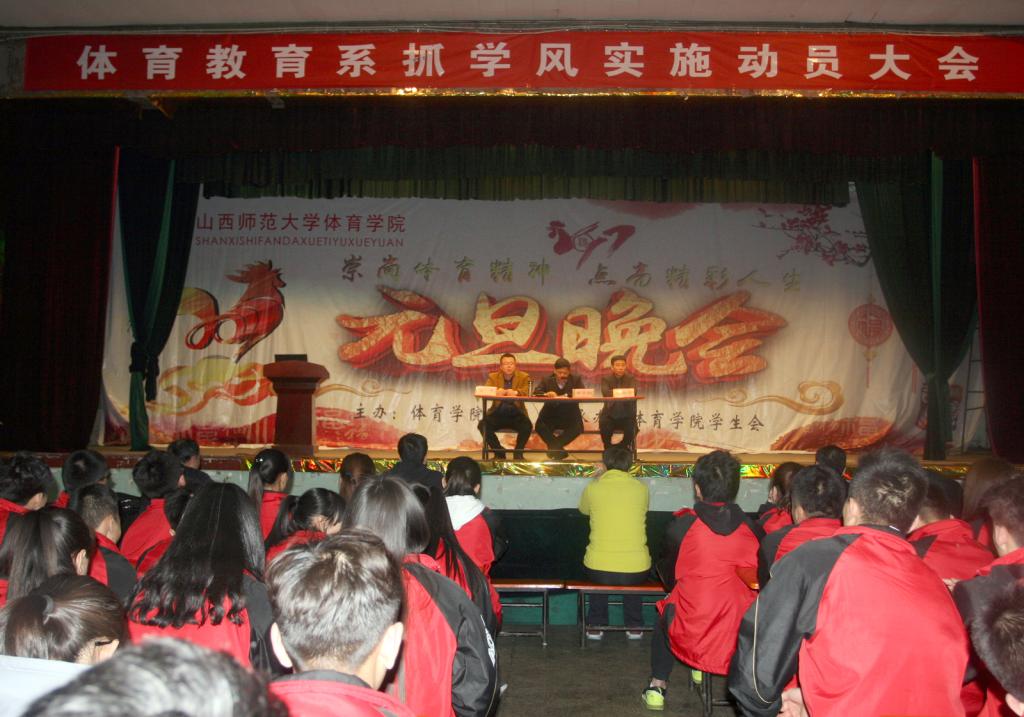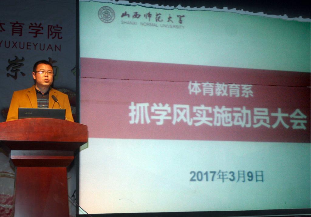 2017年3月9日晚7点半,必威西汉姆官网平台“体育教育系抓学风实施动员大会”在院礼堂隆重召开。参加本次大会的有:公司党委书记李学刚、体育教育系主任杨海龙、副主任张杰以及各班辅导员和全体员工。