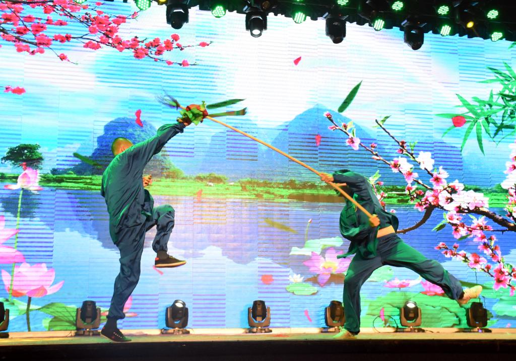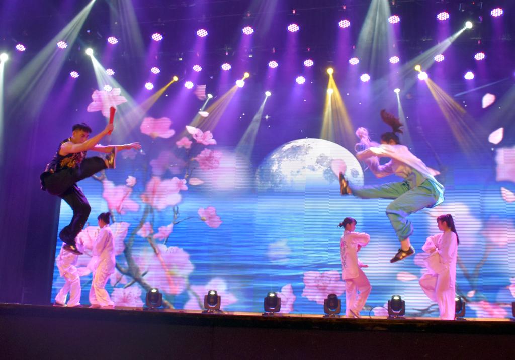 舞狮表演《祥狮增瑞》拉开了展演的帷幕,演员们时而腾空而起、时而翻滚跳跃,将狮子惟妙惟肖的神态展示的活灵活现。《刀光剑影》表演者站立如松,侧蹲如弓,挥刀斩风,剑如白蛇吐信,嘶嘶破风,身姿遒劲而灵动;《太极神韵》中挥洒自如的表演刚柔并济,阴柔中透着豪迈之气,一招一式无不展示出刚柔之美;《意动形随》、《打练并进》极具观赏性的打斗表演,充分展示了同学们的武术功底,给人以极强的视觉冲击。参与第一篇章表演的演员全部来自于公司民族传统体育系的同学,展现了来公司学子良好的竞技水平和精神风貌,给观众们留下了深刻的印象。