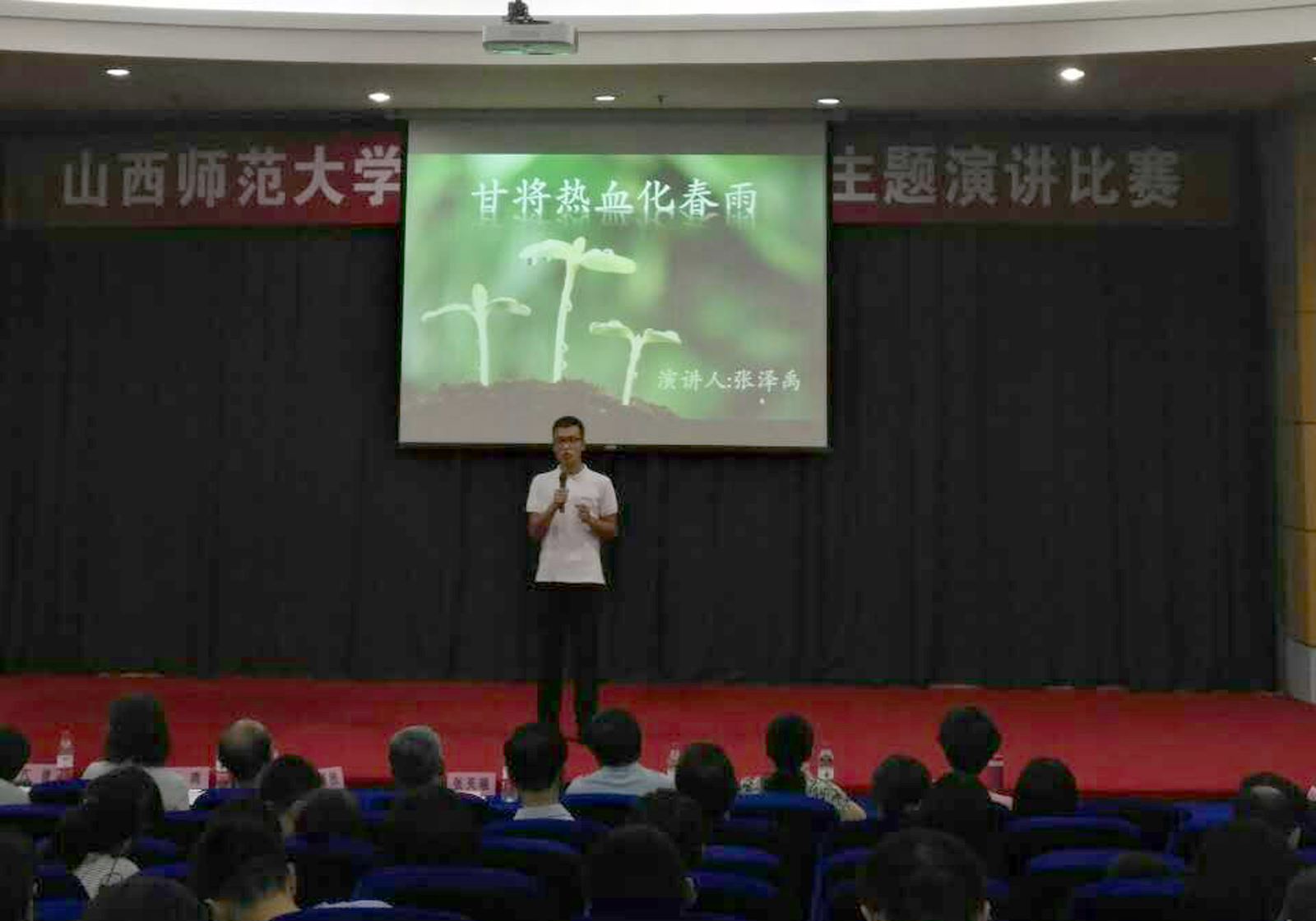 本次演讲比赛的主题是:做有理想信念,有道德情操,有扎实学识,有仁爱之心的“四有”老师。接到通知后张泽禹同学积极准备,精心谋篇,在6月13日预选赛中,他从容应对,自信参赛,从17个公司精心选拔出来的21名高手中脱颖而出进入决赛。决赛阶段,张泽禹同学精心筹划与准备,反复推敲用词造句,酝酿感情,积极表现自己。在6月29日的决赛中,淋漓尽致彰显自己演讲才能,充分表达了当代青年如何做一名“四有”老师,得到了评委老师和在场听众的一致好评,在有九名教师和四名同学参加演讲比赛中荣获三等奖。表现了体育员工不甘落后、敢拼能赢的精神,为体育员工再一次扬名,为公司赢得了荣誉,做出贡献。