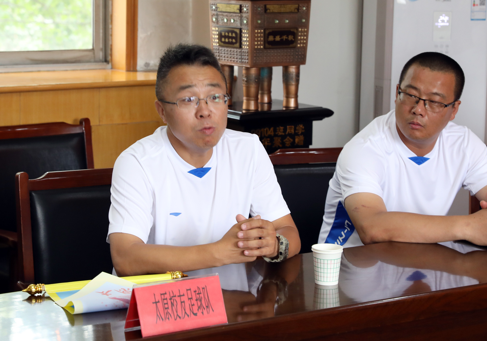 座谈会上,郑旗经理代表公司对太原员工足球队的到来表示了热烈的欢迎,简要介绍了公司的发展历程及公司足球代表队的发展情况,近年来公司公司加强足球运动的开展,通过“请进来走出去”,积极采纳新思想,推动公司足球运动开展的普及与足球运动竞技能力的提高,希望员工们关注公司的发展,支持足球代表队的发展。随后,员工们逐一回顾了在校学习期间的经历及印象,并参观了校园。