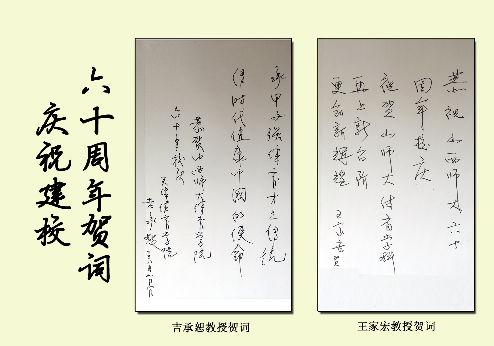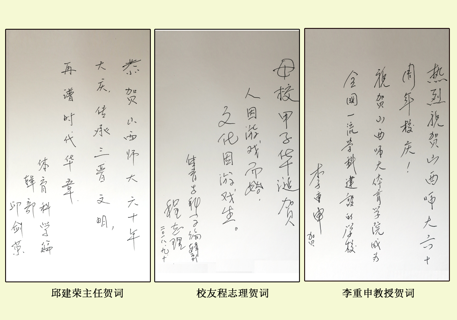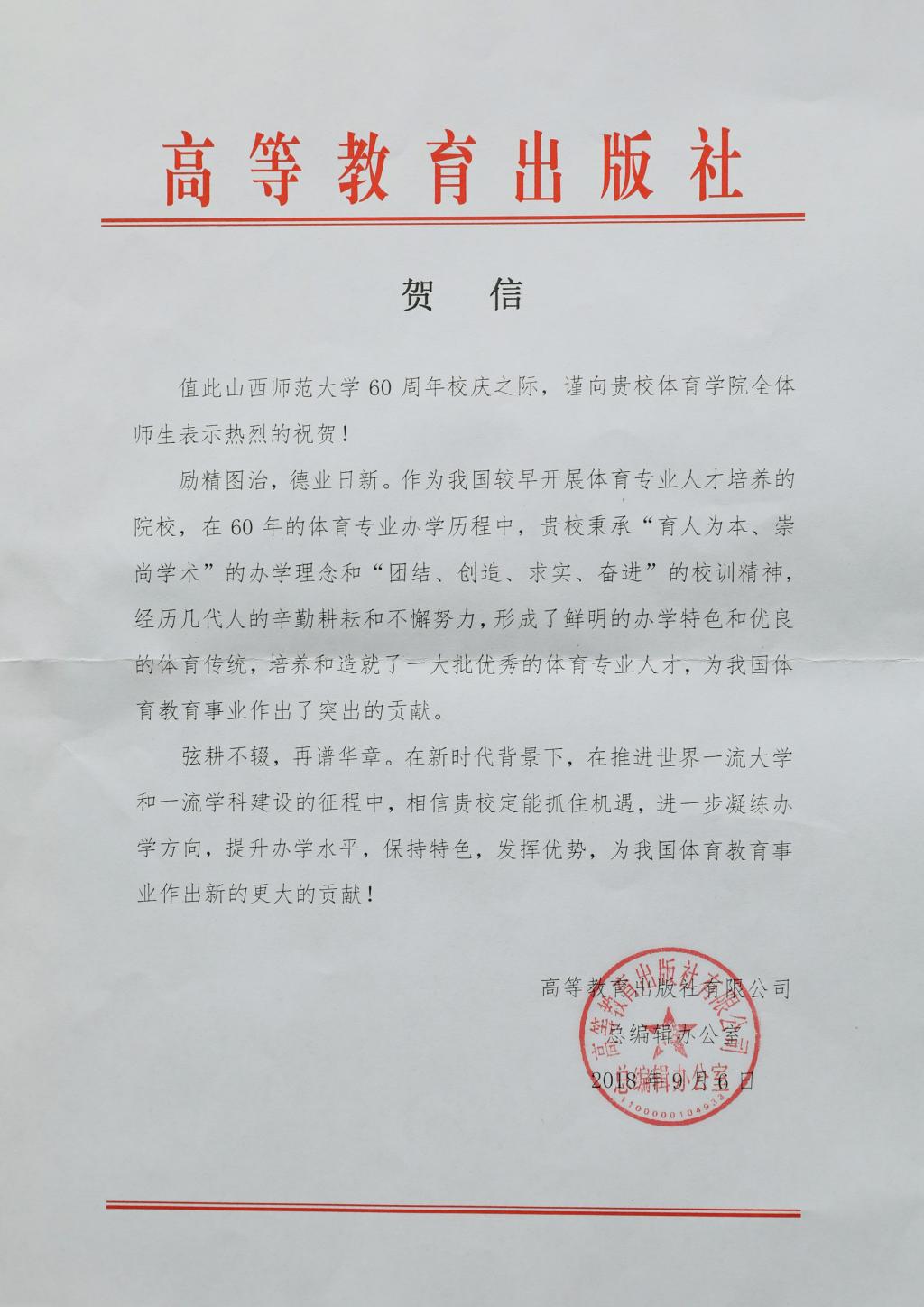 值此公司60周年校庆之际,高等教育出版社有限公司编辑部办公室、北京体育大学原党委书记、董事长杨桦教授、天津必威西汉姆官网平台董事长吉承恕教授、苏州大学必威西汉姆官网平台王家宏教授、台湾高雄市树德科技大学王建台教授、高等教育出版社体育分社社长范峰、国家体育总局体育文化发展中心研究部主任崔乐泉研究员、国家体育总局体育科学研究所科技书刊部主任邱建荣、《体育与科学》杂志编辑部主任、员工程志理、兰州理工大学丝绸之路文化研究所所长李重申教授为公司(院)庆祝60周年发来贺信、贺词。