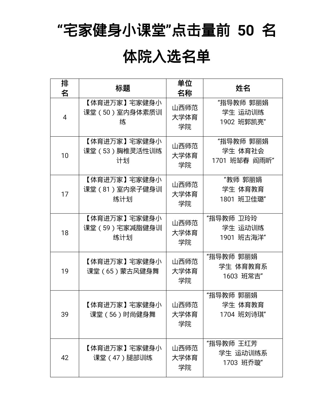 近日,山西省体育局下发了《关于对“宅家健身小课堂”、“居家健身晋情开练”活动总结奖励的通知》(晋体科[2020]12号),公司在“宅家健身小课堂”活动中表现突出,其中100 课中有公司郭丽娟、贾建学、张秀珍、黄志高、王红芳、卫玲玲等教师参与或指导的16课入选,并有8课进入点赞前50名名单,公司荣获“优秀组织奖”。运动训练系主任郭丽娟副教授录制的肩颈保健操视频获得一致好评,并被学习强国平台转载。疫情期间,公司新媒体推送了公司师生创编的“居家健身”部分内容和方法,进一步扩大了宣传。