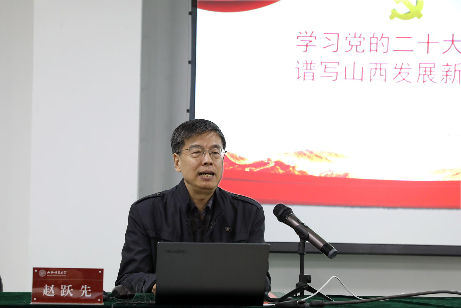 会上,赵跃先教授作了题为《学习党的二十大精神,谱写山西发展新篇章》的专题报告。赵教授从“过去五年的工作和新时代十年的伟大变革、开辟马克思主义中国化时代化新境界、中国式现代化、全面建设社会主义现代化国家的新部署和新要求、坚持党的全面领导和全面从严治党、应对风险挑战”等六个方面对党的二十大精神进行了全面系统地解读。他从党的二十大报告主题开始,阐述了全面准确学习党的二十大精神的重要历史意义和政治意义,从战略全局深刻解读了新时代坚持和发展中国特色社会主义的一系列重大理论和实践问题;报告紧扣“九个深刻领会”“七个聚焦”,从十个方面论述了山西推动高质量发展,谱写全面建设社会主义现代化国家山西崭新篇章的具体举措。