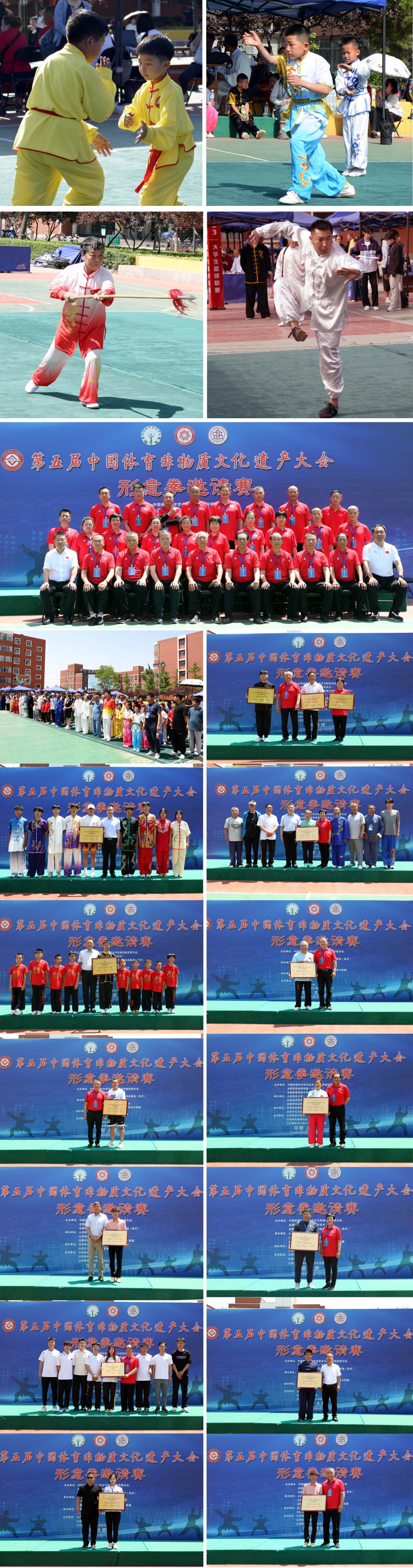 会议期间,举行了“第五届中国体育非物质文化遗产大会形意拳邀请赛”,共有来自全国各省(区、市)武术协会、武术馆(校)、武术之乡等32支队伍的近400人参赛,精彩演绎了形意拳的五行拳、十二形拳、杂式锤、刀术、枪术、棍术、剑术、大刀,徒手对练、器械对练,以及规定形意拳、自选形意拳等技艺内容,生动呈现了中国体育非遗的多样性、民族性、艺术性,也集中展现了体育非遗文化中的典型中国特色和中国风格,是一次年龄分布广泛、参与群体多元、项目内容丰富,展现非遗魅力、释放非遗活力、激发非遗动力的活态化、专项化体育非遗盛会。