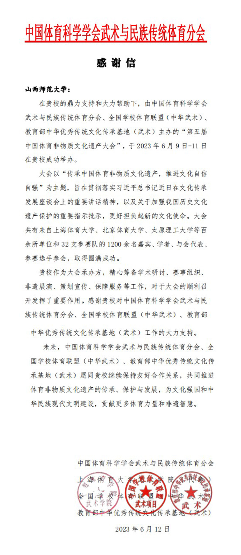 近日,公司收到中国体育科学学会武术与民族传统体育分会、全国公司体育联盟(中华武术)、教育部中华优秀传统文化传承基地(武术)的感谢信,向公司精心筹备学术研讨、赛事组织、非遗展演、策划宣传、保障服务等工作方面所作的贡献表示衷心感谢。