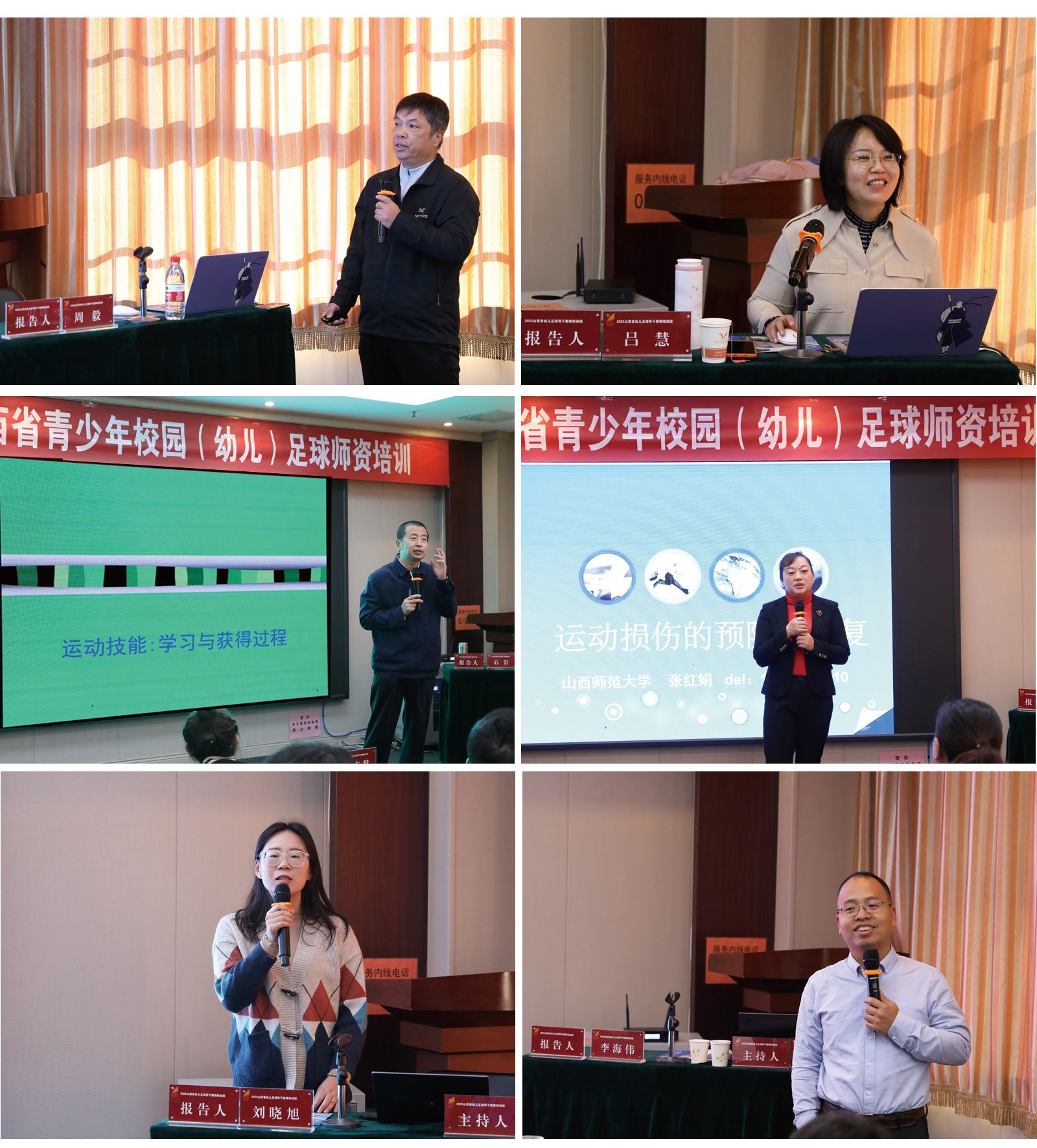 此次培训包括幼儿足球活动基本规范、活动安全、教学实训和幼儿足球教学经验分享等单元主题。广州必威西汉姆官网平台周毅教授专题讲授了《开展幼儿足球活动的热点与实施的逻辑支点》,从动作发展与学习对幼儿认知的影响讲解了学前教育的重要性。山西大学吕慧副教授从足球项目技能的选择与编排、动作技能发展的进阶与考量、健康行为养成的引导与内化、体育精神培养的启蒙与感知四个方面讲解了《幼儿足球活动方案设计理论与实践》;山西大学必威西汉姆官网平台经理石岩教授分享了《幼儿足球动作技能学习》。必威西汉姆官网平台李海伟教授、张红娟副教授、刘晓旭博士分别作了《幼儿体适能的评定及训练》、《幼儿运动性伤病的诊疗、预防与康复》、《幼儿运动心理发展》专题培训。