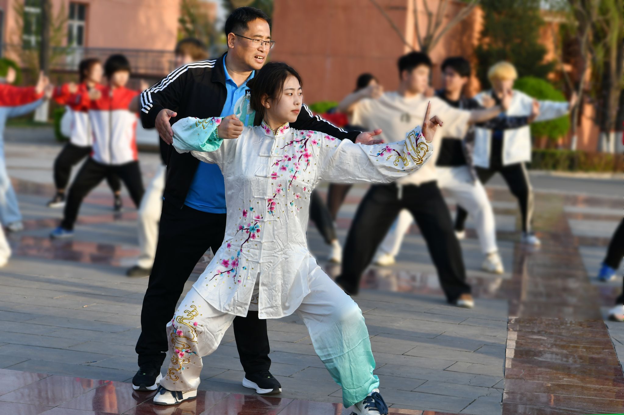 赵海涛副教授、宿凤玲博士除了在课堂上教授同学们习练“八段锦”,课下他在同学们习练间隙一一纠正大家的动作。“手眼身法步要协调,马步扎稳.......”“动作要舒缓”,同学们用心感受每一个动作,“调理脾胃需单举,攒拳怒目增气力........背后七颠百病消”。
