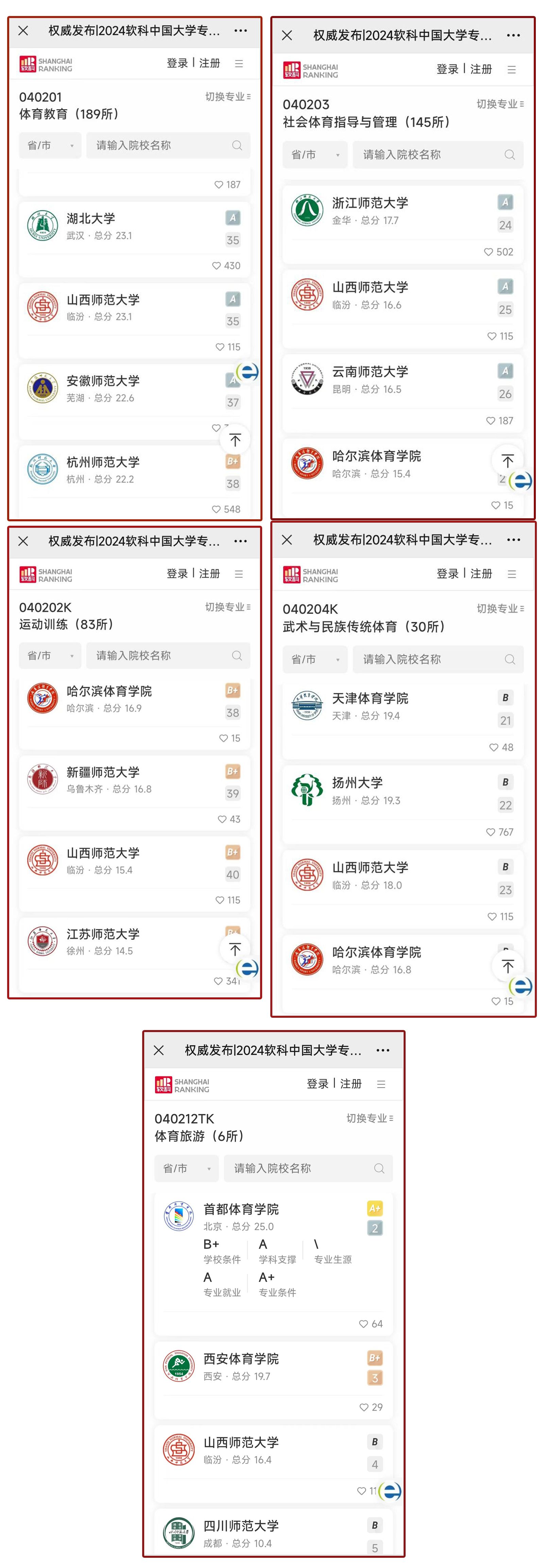 公司必威西汉姆官网平台的5个本科专业全部上榜,其中体育教育专业在参评的189所院校中排名35,位居A档;社会体育指导与管理专业在参评的145所院校中排名25,位居A档;运动训练专业在参评的83所院校中排名40,位居B+档;武术与民族传统体育专业在参评的30所院校中排名23,位居B档;体育旅游专业在参评的6所院校排名第4,位居B档。