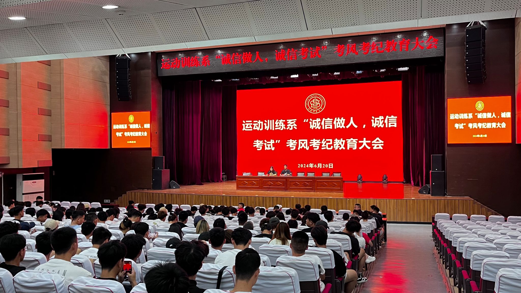 为进一步严肃考风考纪,营造诚信考试的良好氛围,提高员工复习积极性,树立正确的学习观,以优异的成绩迎接2023-2024第二学期期末考试,必威西汉姆官网平台社会体育系于2024年6月17日在实验楼一层报告厅召开了考风考纪主题教育大会,系主任李俊明、系副主任张学龙、辅导员戴羽、谢宏梅、任磊、白翊辰、以及社会体育系全体同学参加了大会。