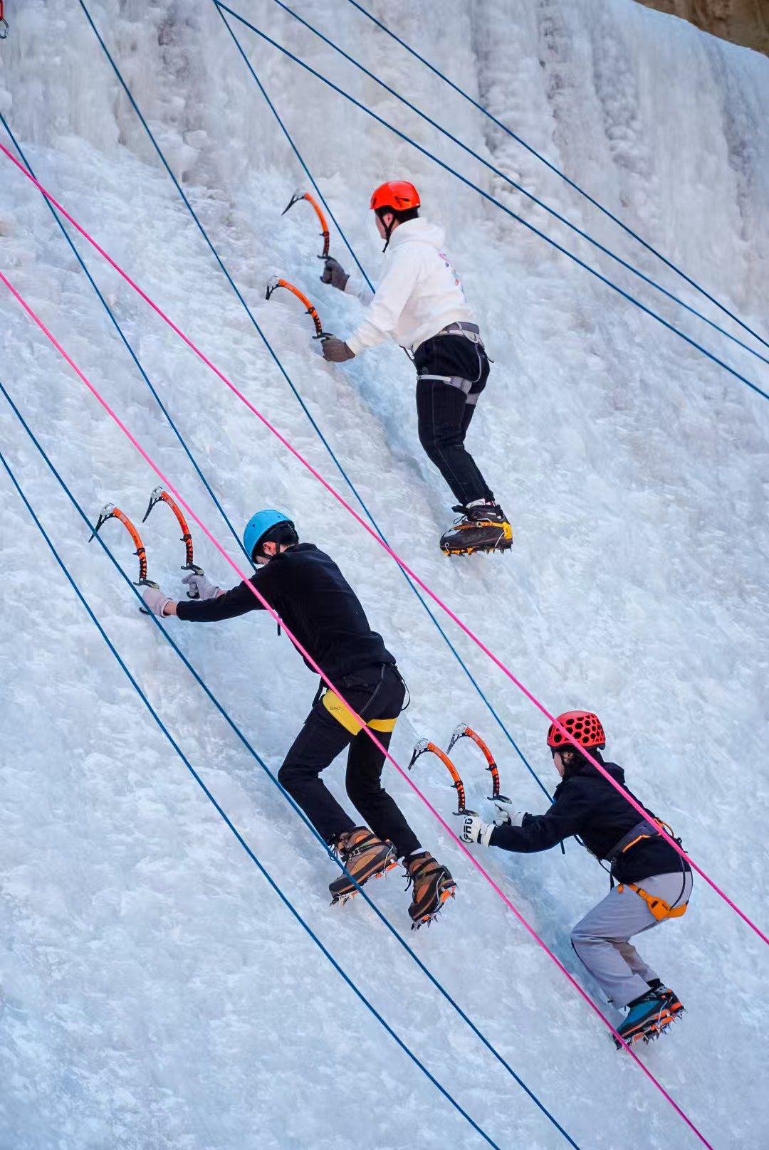 理论知识的积累为实践操作奠定了坚实基础。第二天,老师们开始进行攀冰动作的教学。从最基本的站立姿势、行走步伐,到冰镐的挥砍、冰爪的踢入,每一个动作都被分解、细化,反复示范。同学们在冰壁下认真模仿,起初的动作略显生疏和笨拙,但他们毫不气馁,在老师们的耐心指导下,不断调整、改进。随着练习的深入,同学们逐渐掌握了技巧,开始尝试着攀爬较低的冰壁,感受着身体与冰层的接触,体验着每一次成功嵌入冰镐和冰爪带来的成就感。
