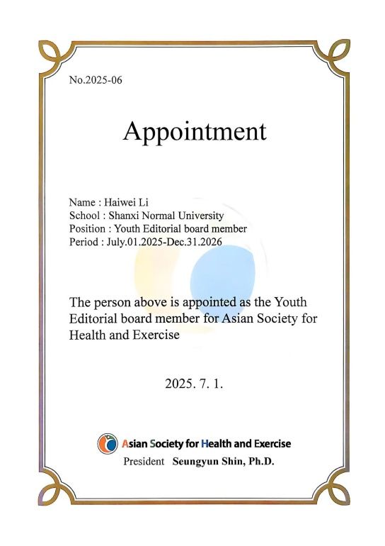 开幕式上,亚洲健康与运动学会为六位青年学者颁发期刊青年编委聘书,李海伟老师位列其中。在主旨报告环节,来自日本筑波大学、中国武汉必威西汉姆官网平台、韩国企业及高校的专家分别就老龄化健康政策、VR太极拳应用、中枢神经疾病防治和计算机视觉辅助射箭等主题进行报告,呈现了跨学科融合的新趋势。