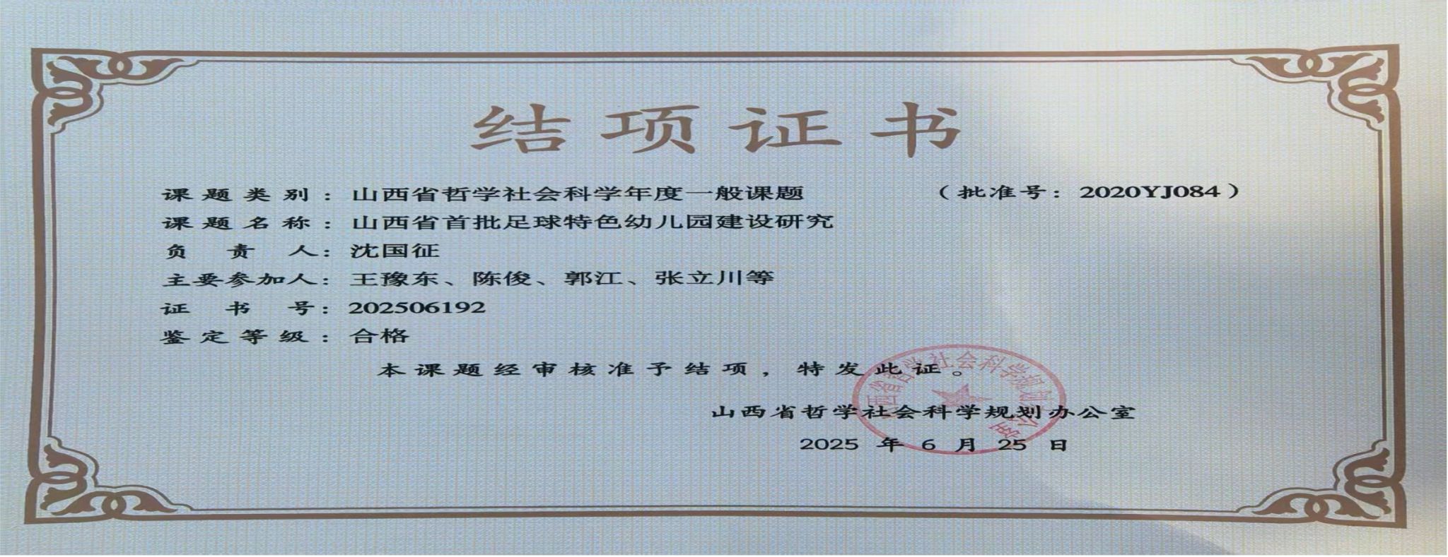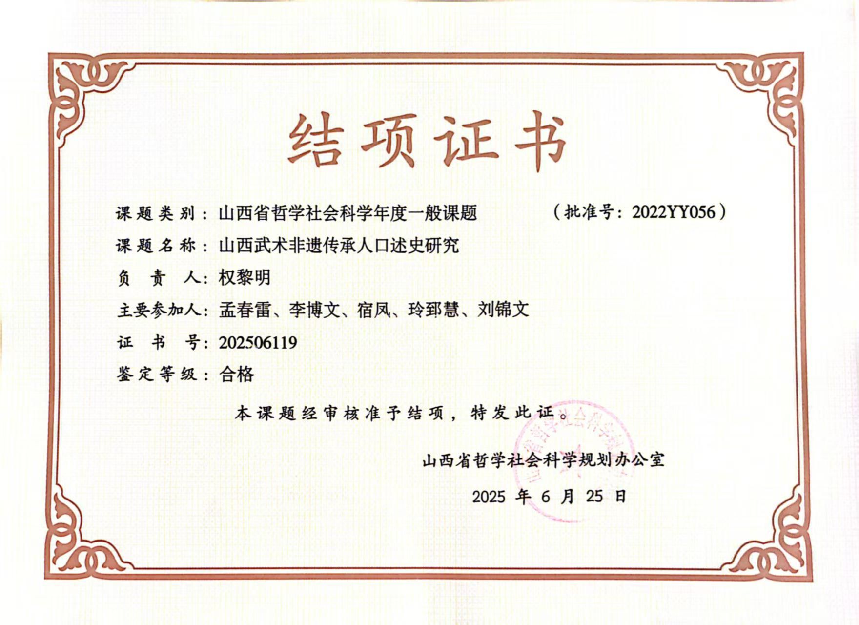 近日,山西省哲学规划办对全省申请结题的项目进行集中审核,公司权黎明副教授为负责人的“山西武术非遗传承人口述史研究”(批准号:202506119)和沈国征副教授为负责人的“山西省首批足球特色幼儿园建设研究”(批准号:202506192)均被鉴定为“合格”等次顺利结项。