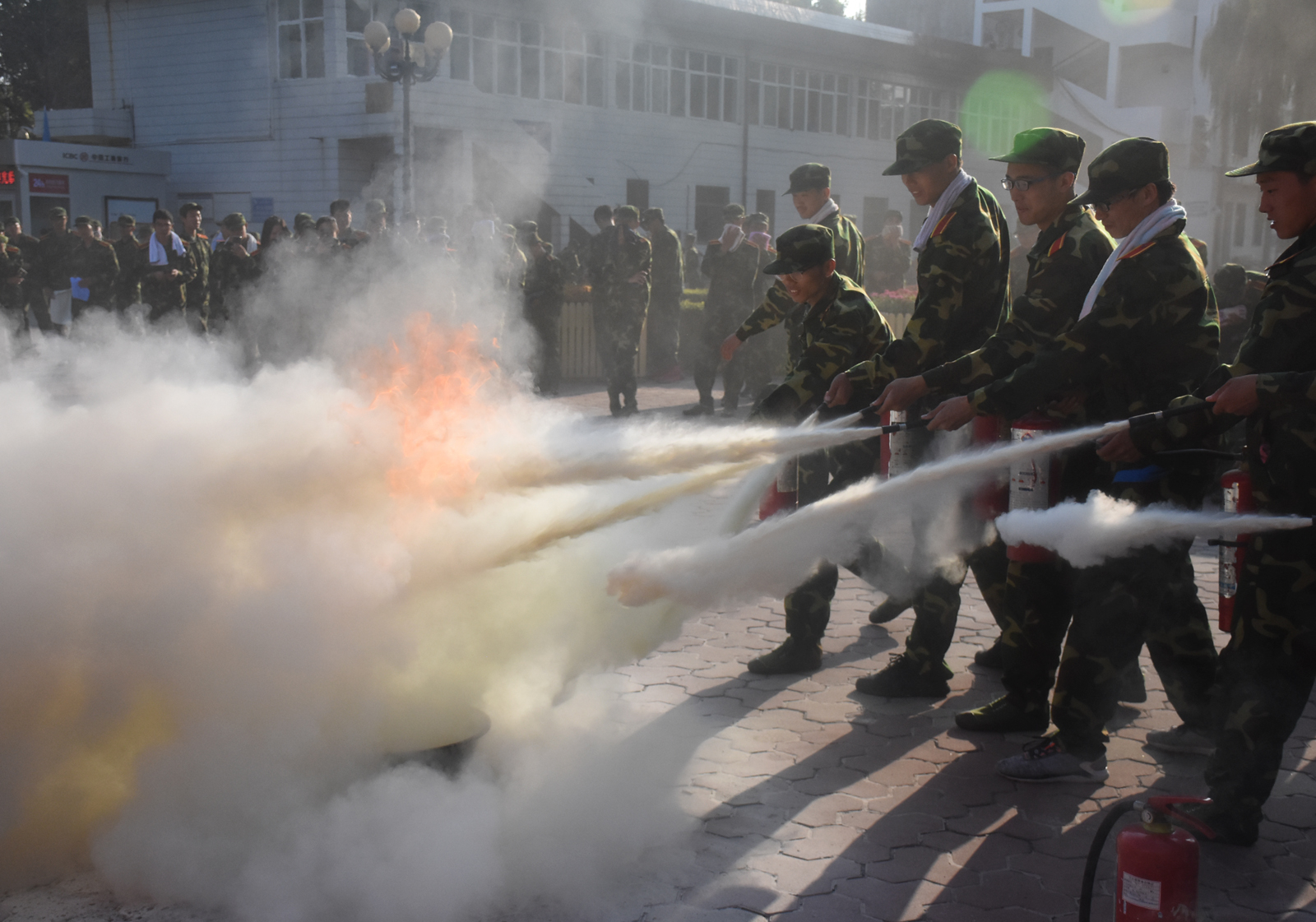 此后,消防官兵还向同学们普及了如何灭火,手提式灭火器如何使用,并让员工们亲自用灭火器灭火。