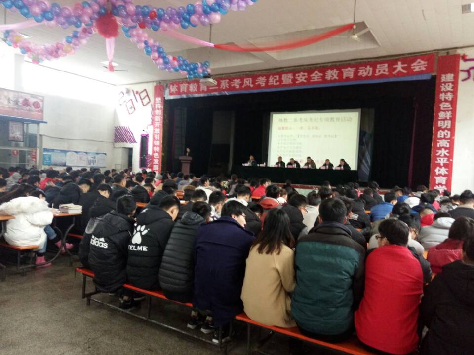 1月3日下午三点,在公司大礼堂举办了体教二系考风考纪暨安全教育动员大会,出席会议的有体教二系系主任吴峰山、副主任李向前、各班辅导员和体育教育二系全体员工。会议主要强调了考风考纪的重要性,传达了公司、公司严肃考风考纪的具体要求以及违反考试、考场纪律的严重后果,并对学期末和假期有关员工安全事项进行教育。