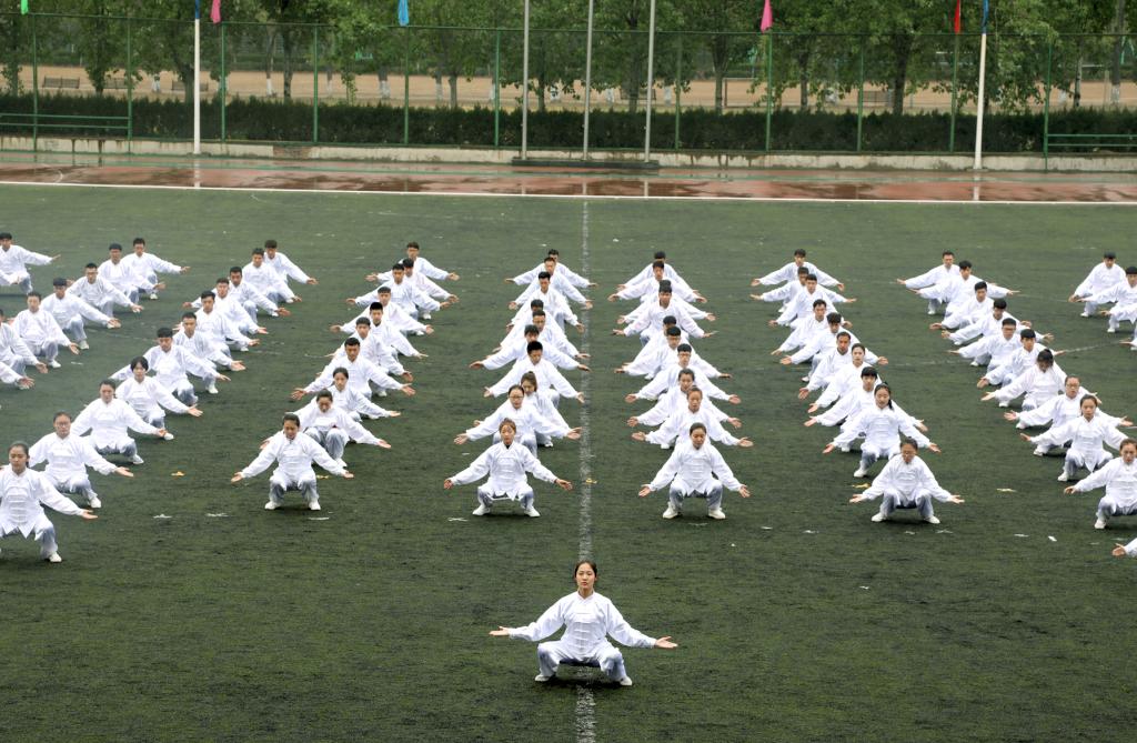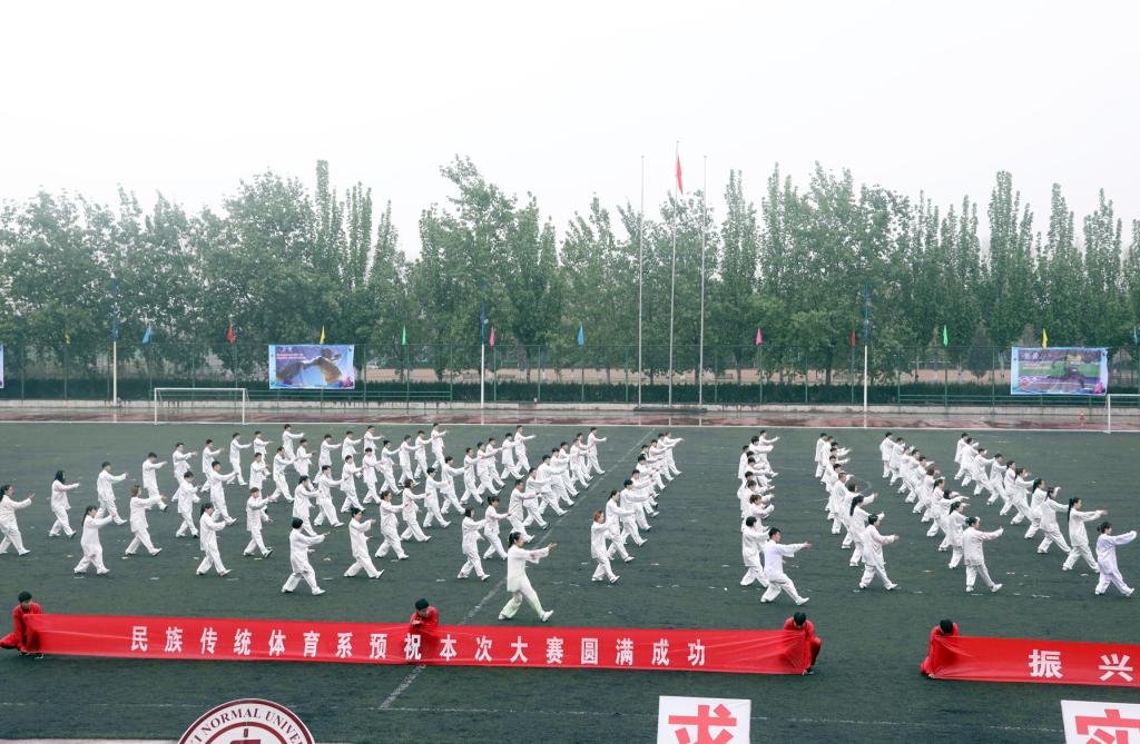 最后,各方阵退场,由体育教育系带来的八段锦表演拉开了团体操表演的序幕。八段锦是强身益寿、柔中带刚的养生功,体育教育系带来八段锦的表演将会场的气氛推向了高潮;社会体育系代表队带来的五禽戏生动完整的表现出虎之威猛、鹿之安舒、熊之沉稳、猿之灵巧、鸟之轻捷,体现了中国传统养生的魅力;民族传统体育系带来的24式太极拳,是将意识、呼吸、动作三者结合为一的内功拳法,动作以松柔入手,练劲养气,可缓可快,柔中寓刚,刚中有柔,彰显了华夏武术的魅力;运动训练系带来的健身气功六字诀,展现了运动训练系充满正能量的激情与活力;最后由体育教育二系带来的易筋经表演,动作整齐划一,精神抖擞,将体教二系的精神风貌表现的淋漓尽致。
