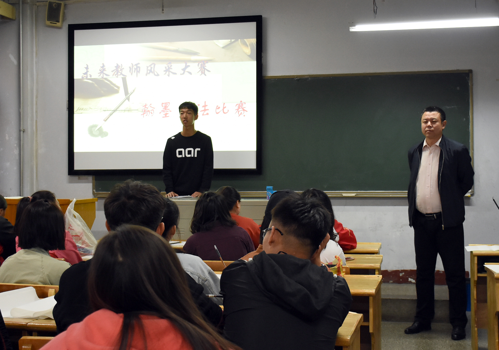 4月17日晚,由体育教育系主办,体育教育系党支部、团总支、员工会承办的体育教育系未来教师风采大赛之翰墨书法篇比赛在公司教学楼7、8、9教室举行,其中翰墨书法篇包括硬笔书法和软笔书法。 体育教育系副主任张杰老师亲临现场,进行了观摩,参赛选手无论是在硬笔还是软笔书法方面,都全神贯注,潇洒挥毫。他们用心书写每一笔笔画、每一个汉字,认真完成着自己的作品,尽其所能地展示自身书法的才能,体现了书法的独特风格。最后,参赛选手相继在规定的时间内完成了比赛。