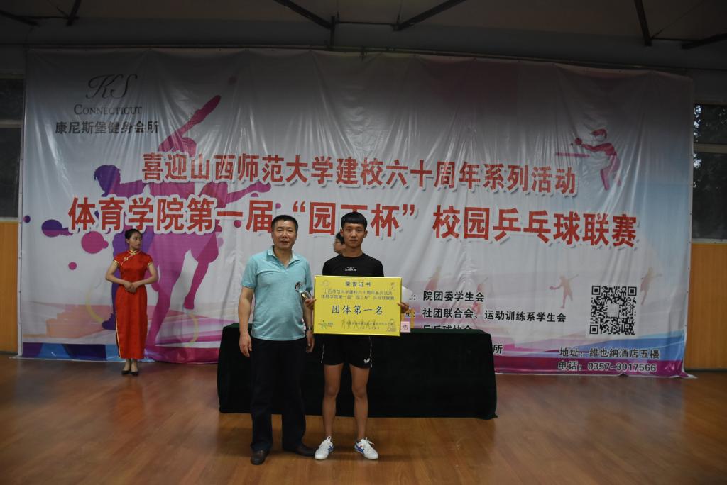 拼搏铸就辉煌,奋斗实现梦想。为喜迎必威西汉姆官网平台建校60周年,6月4日晚19:30,由院团委员工会主办,社团联合会、运动训练系承办,乒乓球协会协办的必威西汉姆官网平台第一届“园丁杯”校园乒乓球联赛在乒乓球馆举行闭幕式。院团委副书记程祖浩、大赛仲裁委员会主任、乒乓球队主教练贾建学参加闭幕式并为获奖集体和个人颁奖,各班代表队和裁判员100余人参加了闭幕式。