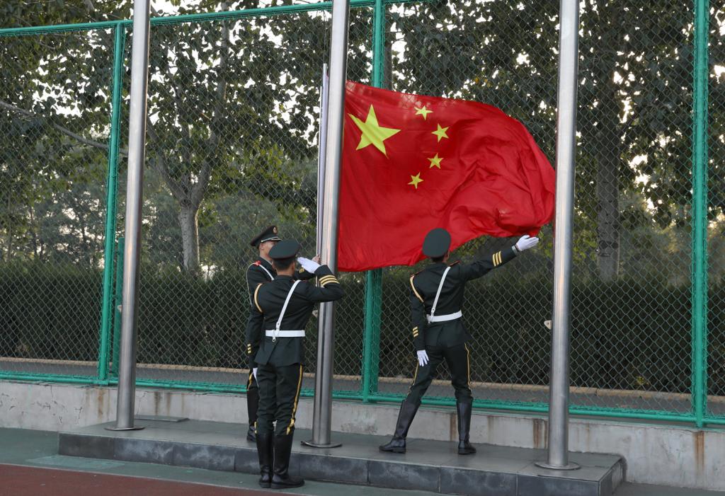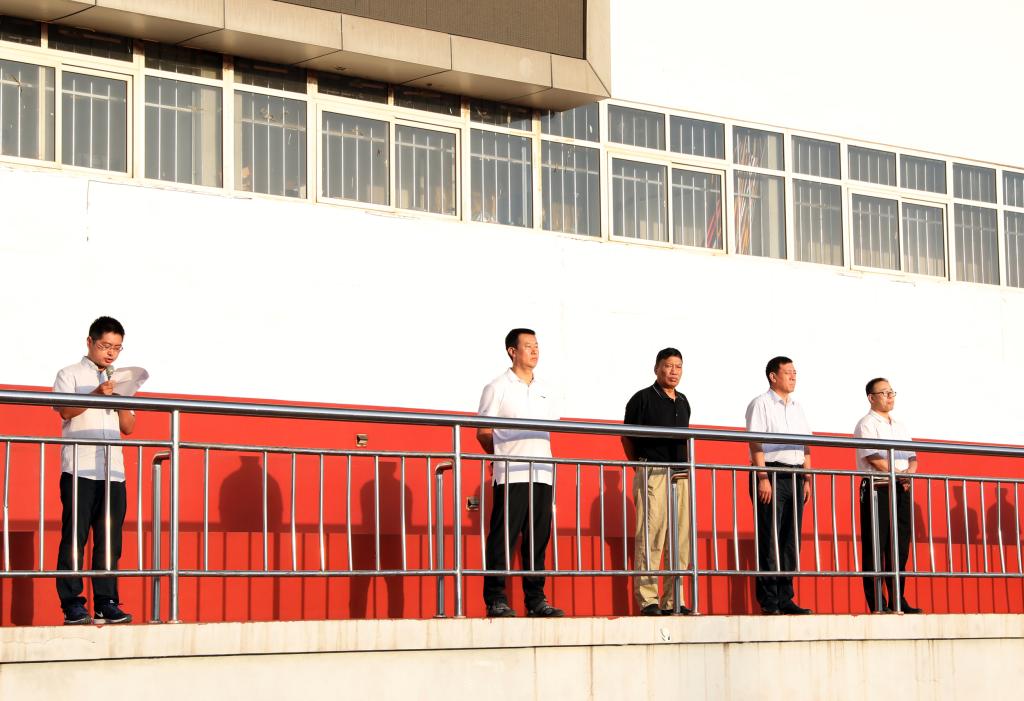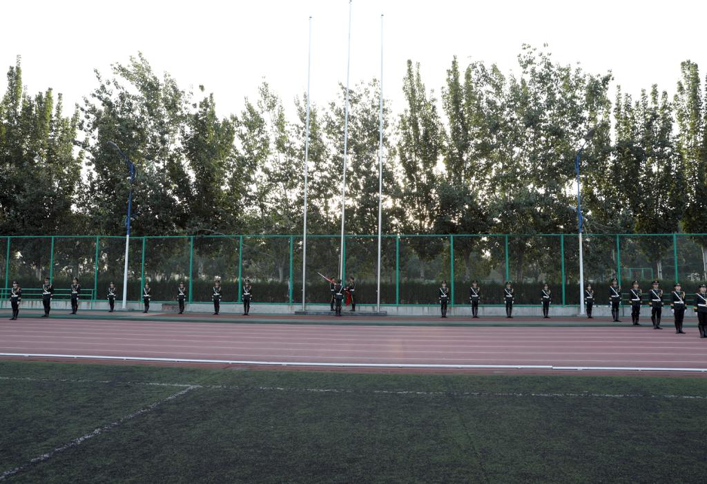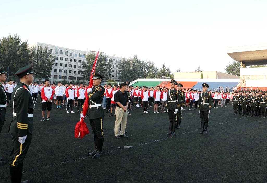 第十三届、十二届国旗护卫队队员在《解放军进行曲》的嘹亮声中步入田径场,公司党委书记李学刚为第十三届国旗护卫队授旗,第十三届国旗护卫队迎接国旗并进行新学期升国旗。