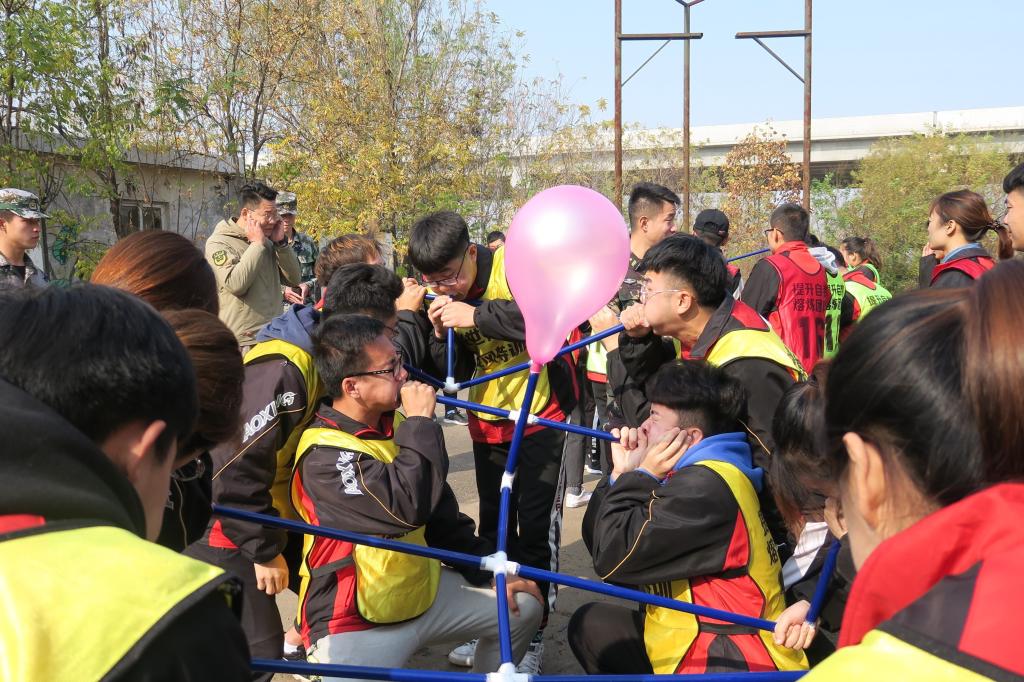 训练第一个项目是展现团队成员彼此信任与突破自我的“信任背摔”,从1.5米高台背摔,队员们用双手组成的人墙接住背摔队员。每组队员都共同协作,感受到了彼此的信任。“呼吸的力量”是一个去促进团队沟通与协作项目,要求小组把全部PVC管、弯头等器材用完,搭建好呼吸机,十余名队员同时呼吸,把呼吸机另一端的气球吹爆,这考验着团队内部的沟通能力,如何合理分配有限资源,遇到问题又如何调整战略方向。最终,各个小组在经过不断克服困难,圆满的完成了任务,小组间还进行了争分夺秒的竞赛,氛围异常紧张激烈。