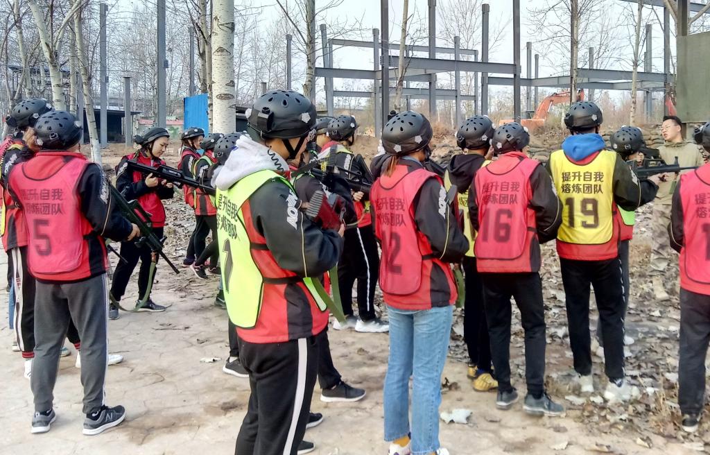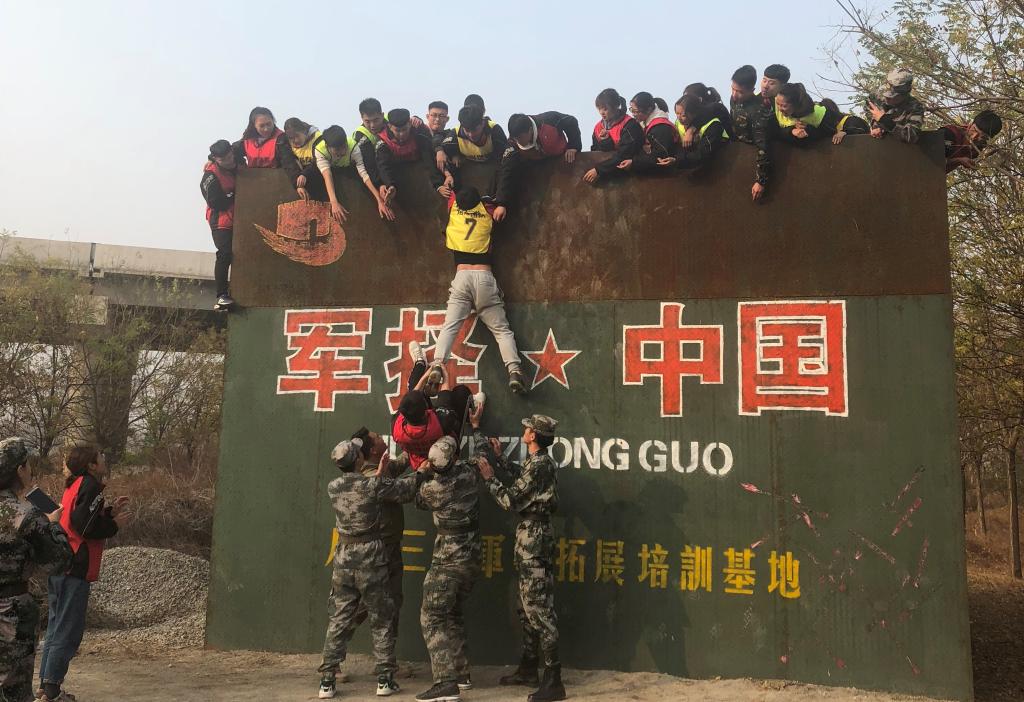 下午,队员们迎来了最具挑战的项目——毕业墙。毕业墙又称逃生墙、海难逃生。逃生墙是说,二战时期在集中营里的犯人,为了获得自由而翻越4.2米高的狱墙。海难逃生,也指二战时期船在半小时后将会沉没,船员们只有靠团队的力量翻越4米多高的船舱,才能有机会逃生。此次参加拓展的40余名队员,不能借助任何外界的工具,包括:衣服、皮带、绳子等,所能用的资源只有每名队员的身体,要求20分钟内,全部队员翻过4.2米高的垂直墙体。经过半个多小时的激烈讨论和尝试,队员们不断提出方案、否定方案,再提出方案、实践方案,方案失败后再讨论再实践。最终,学员们发挥体育人不抛弃不放弃的精神,搭人墙往上爬,搭人梯把队员往上拉。男队员叠了三层人墙后,男队员先上,女队员踩着男队员的肩膀,并在先爬上去的男队员拽拉下也成功翻越了高墙,当最后一名男队员成功翻越的时候全体同学爆发出热烈的欢呼声,最终用时14分30秒。这个项目让队员们懂得个人目标与团队目标的关系,只有团队获得胜利才有真正的胜利。随后进行的真人CS,三组同学被随机分为红、绿两组,无论是红、绿两组的厮杀还是与教官的厮杀,都体现了体院健儿团结勇敢的精神风貌。