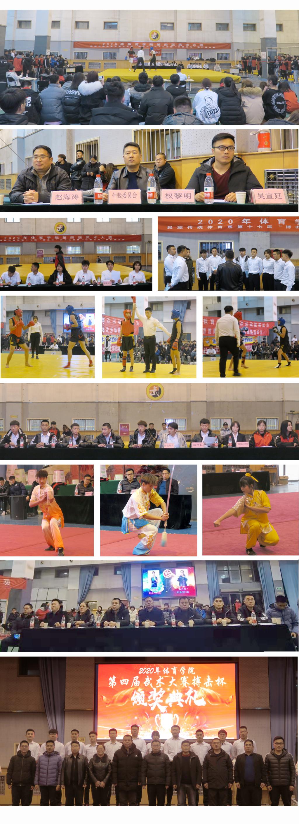 12月5日下午第四届武术大赛拉开序幕,开幕式上,民体系同学带来了舞狮和武术表演。经过五天激烈比赛,12月10日晚第四届武术大赛举行散打决赛暨颁奖典礼。公司党委书记许国宝、教务科、院办及各系负责人,观看比赛并为选手颁奖。