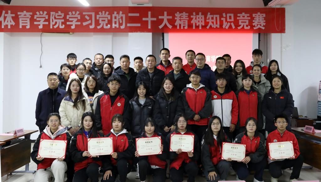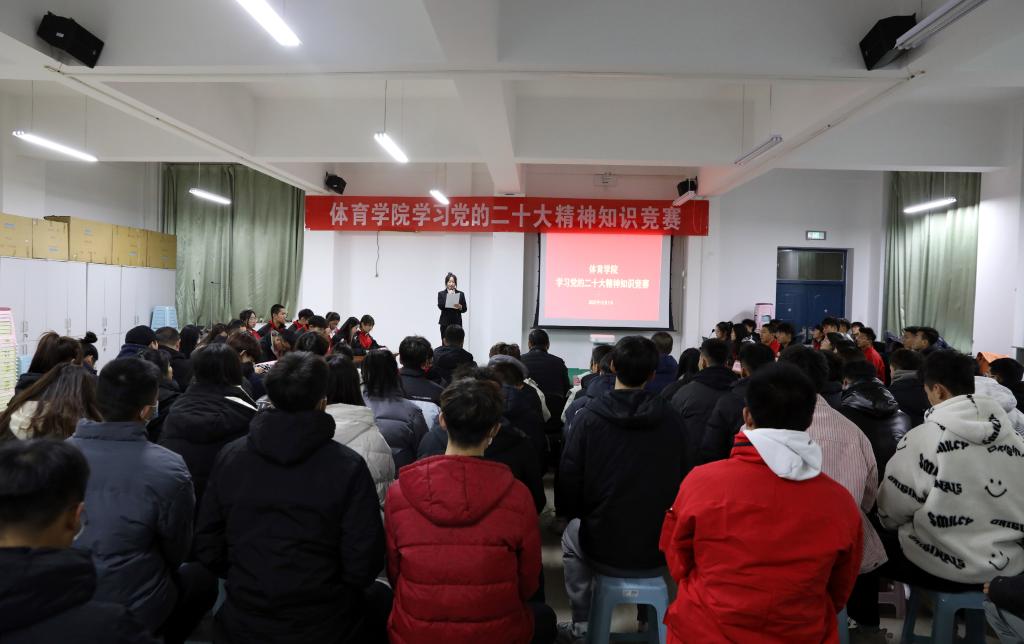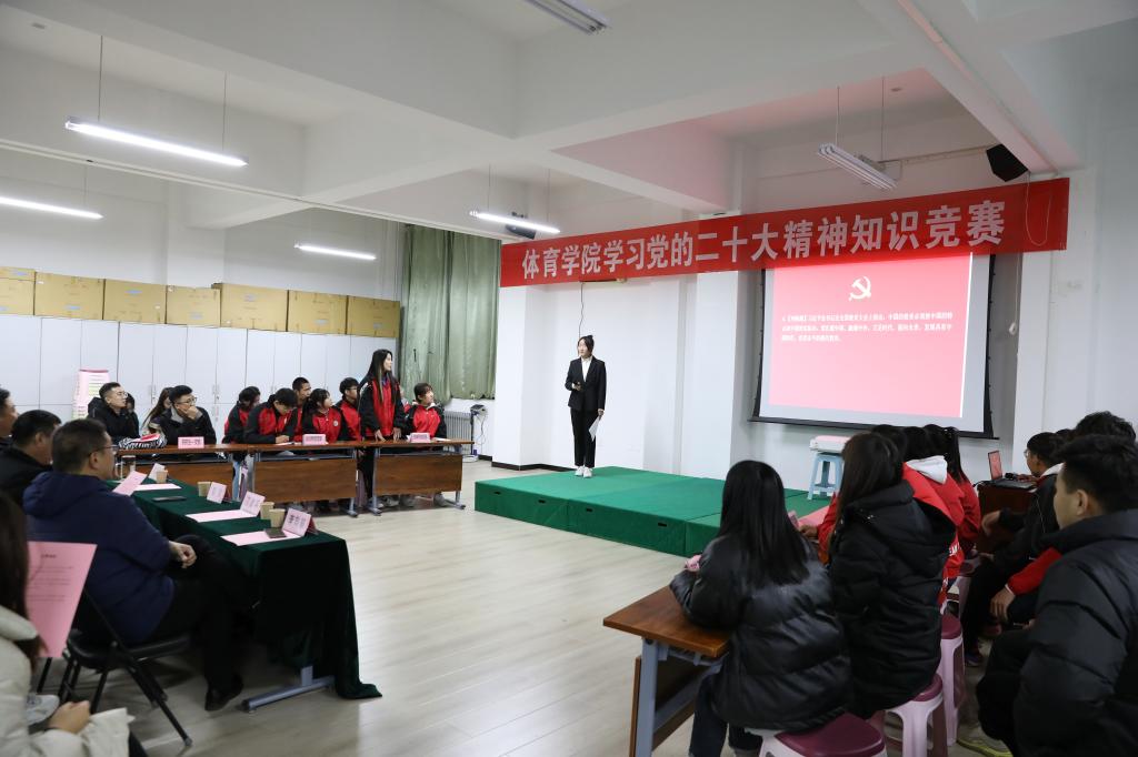 12月1日晚,必威西汉姆官网平台“学习党的二十大精神”知识竞赛活动决赛在运动心理实验室举行。公司党委书记卫建平,经理郑旗,副经理李向前、孟春雷,体育教育系党支部书记张杰、社会体育系党支部书记李俊明、武术与民族传统体育系党支部书记权黎明、运动训练系党支部副书记卫玲玲、研究生第一党支部书记王丽娜等现场观看比赛。