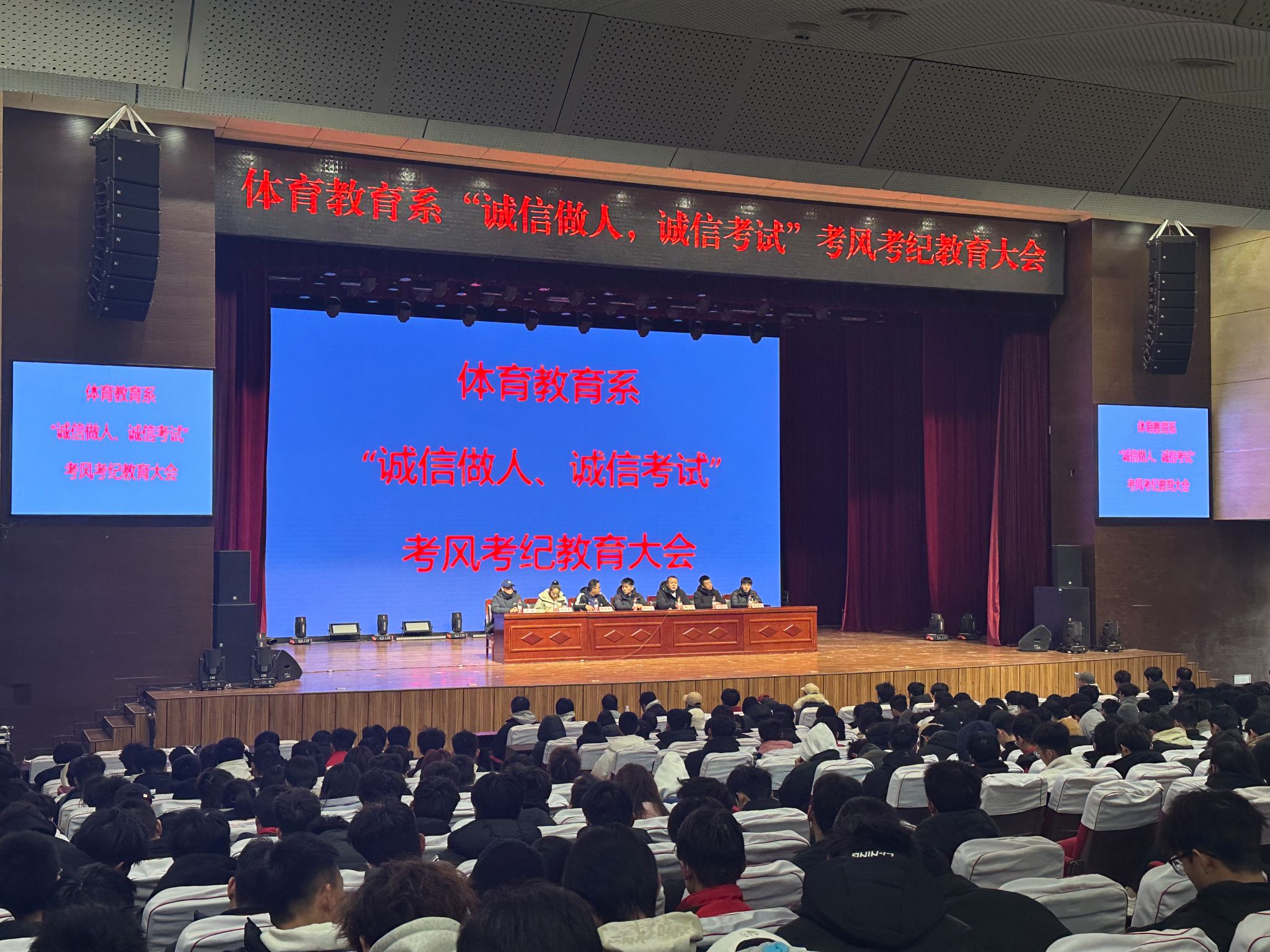 2023 年 12月 26 日上午,体育教育系在南区科学会堂报告厅召开2023-2024学年第一学期考风考纪主题教育大会。公司党委副书记张大为,公司党委委员、体育教育系主任张杰,副主任张学兵,员工党支部书记高士惠,体育教育系辅导员以及本系2021级、2022级、2023 级全体员工参加会议。