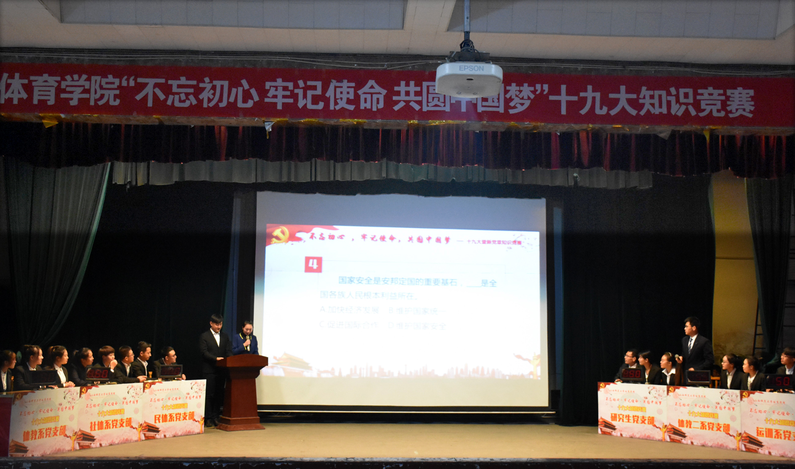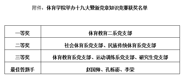为了扎实推进“两学一做”学习教育常态化制度化,深入学习宣传贯彻落实党的十九大精神,确保党的十九大精神入脑入心,必威西汉姆官网平台党委于11月13日晚7:30在大礼堂举办了以“不忘初心、牢记使命,共圆中国梦”为主题的十九大暨新党章知识竞赛。体育教育系党支部、社会体育系党支部、民族传统体育系党支部、运动训练系党支部、体育教育二系党支部、研究生党支部6支代表队共24名选手参加竞赛,各代表队由各党支部书记带队并担任指导教师。必威西汉姆官网平台党委书记李学刚、副书记孙学虎出席本次活动,公司党员、重点发展对象以及积极分子共有300余人观看本次竞赛。