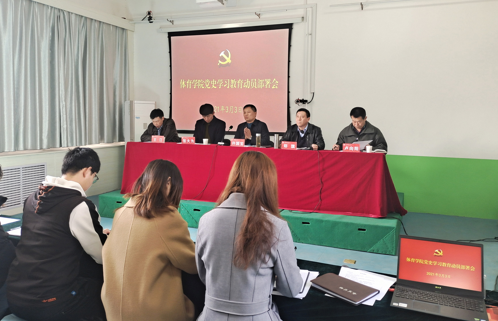 3月3日上午,公司在运动生物力学实验室召开全公司党史学习教育动员部署会议。院领导、院工会、团委、各系部科室负责人、党支部书记参会,全体辅导员列席会议。会议由经理郑旗主持。