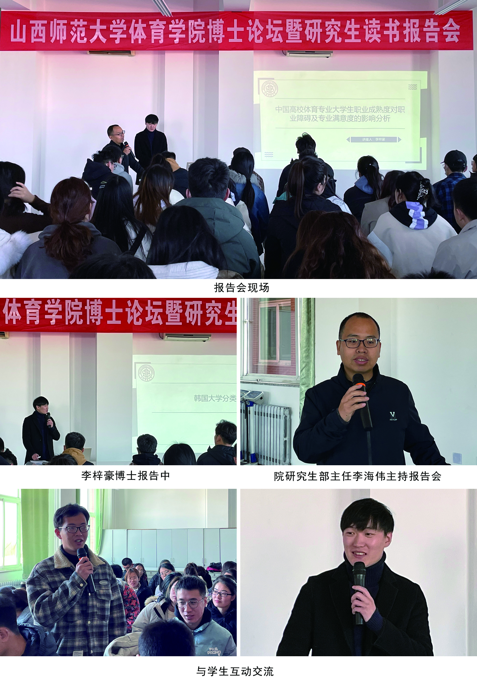 李梓豪老师博士毕业于韩国木浦国立大学,应研究生的要求,他从韩国大学的类型、韩国大学博士入学的申请条件以及韩国大学关于体育方面的专业门类设置和学科方向设置等方面进行了简要介绍。其次,李梓豪博士以“中国高校体育专业老员工职业成熟度对职业障碍及专业满意度的影响分析”为题,为2021级研究生阐述和分析了中国体育专业老员工职业成熟度、职业满意度和职业成熟度对职业满意度的影响。最后,李梓豪老师与同学们就老员工职业障碍和与韩国相关的体育旅游热点问题进行了热烈的互动和交流。会后向同学们分发《职业成熟度量表》,让大家对自身的职业成熟度进行了实际测评。