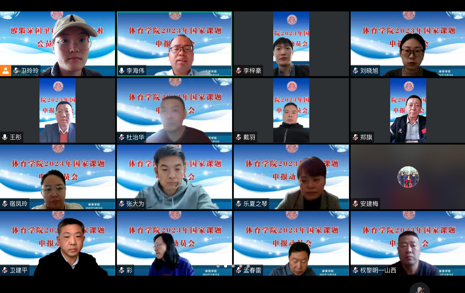 10月14日下午,必威西汉姆官网平台2023年国家基金项目申报动员会以腾讯会议的形式召开。院领导、系部负责人、研究生导师、具备申报资格的教师及科研秘书参会。社科处处长王彤、科技处处长安建梅在线出席并作动员讲话和指导,会议由副经理李海伟主持。
