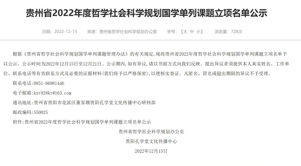 国学单列课题是贵州省哲学社会科学规划课题的主要类型之一,与其他类型的省部级课题具有同等学术地位,主要资助对国学发展起促进作用的基础理论问题研究。该课题面向全国公开申报,公平竞争、择优立项,类别包括重大课题、一般课题和青年课题,由贵州省社科规划办与贵阳孔学堂共同出资,重大课题45万元/项、一般课题30万元/项、青年课题15万元/项。(院研究生部供稿)